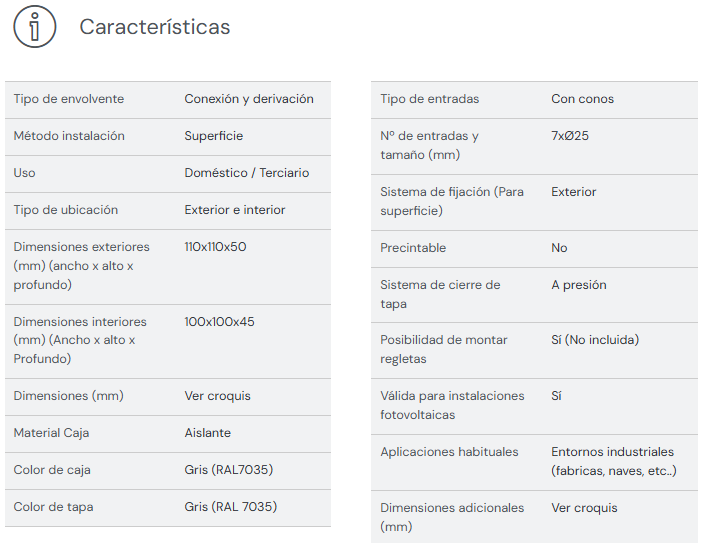 Caja estanca de conexión con conos. Color gris.IP55. IK07. Dimensiones:110 x 110 x 50 mm. Dimensiones interiores 100 x 100 x 45 mm. Cierre con tapa a presión. Con 7 conos para tubo Ø 25 mm.