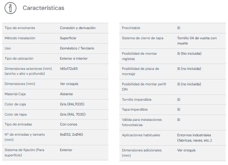 Caja estanca de conexión con conos. Color gris.IP55. IK08. Dimensiones interiores 160 x 135 x 70 mm. Cierre con tornillos 1/4 de vuelta. Precintable. Con 8 conos para tubo Ø 32 mm y 2 conos para tubo Ø 40 mm.