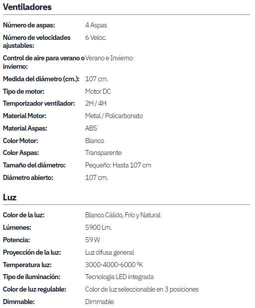 Ventilador Dc Papiro 59w Blanco 4aspas desp.107d 5900lm Reg.intensidad 3000k,4000k,6000k Remoto+ Memoria+ Temporizador